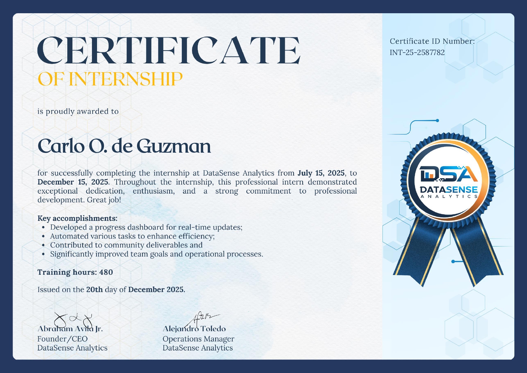 Completed an intensive Data Analyst Specialist Mastertrack strengthening my end-to-end analytics skills across Excel, SQL, Power BI, and Python. The program sharpened my ability to deliver business-ready insights: from data cleaning, modeling, and analysis to report and dashboard creation, and gave me the confidence to participate in DataSense Analytics’ public data challenges, earning one Championship title, two 2nd-place finishes, and a Top 4 placement, which were showcased in the Featured Projects section, further accelerating my project quality and analytical depth.